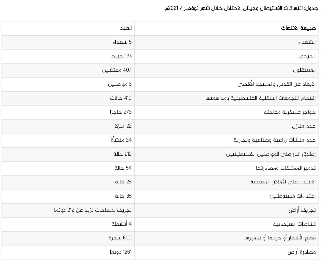 يستعرض التقرير التالي وبشكل موجز أبرز اعتداءات جيش الاحتلال الإسرائيلي، وأهم الانتهاكات الاستيطانية بحق الفلسطينيين خلال شهر نوفمبر 2021.