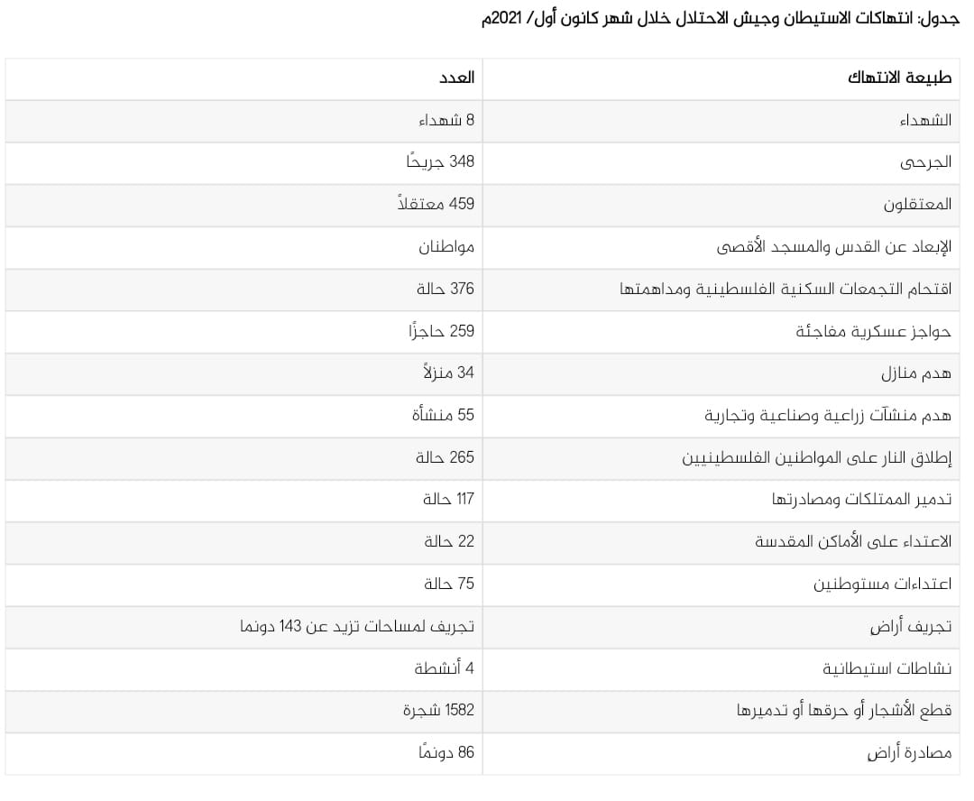 يستعرض التقرير التالي وبشكل موجز أبرز اعتداءات جيش الاحتلال الإسرائيلي، وأهم الانتهاكات الاستيطانية بحق الفلسطينيين خلال شهر ديسمبر 2021.