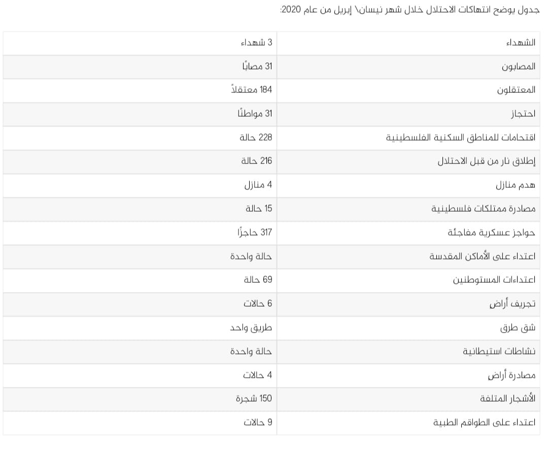 يستعرض التقرير التالي أبرز اعتداءات جيش الاحتلال الإسرائيلي ، وأهم الانتهاكات الاستيطانية بحق الفلسطينيين وممتلكاتهم خلال شهر أبريل 2020.